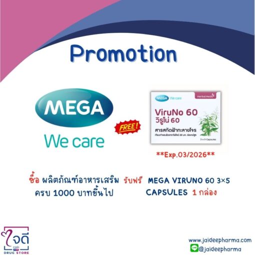 ซื้อ สินค้า MEGA ครบ 1,000 บาท รับฟรี MEGA VIRUNO 60 3×5 CAPSULES **exp 03/26** 1กล่อง